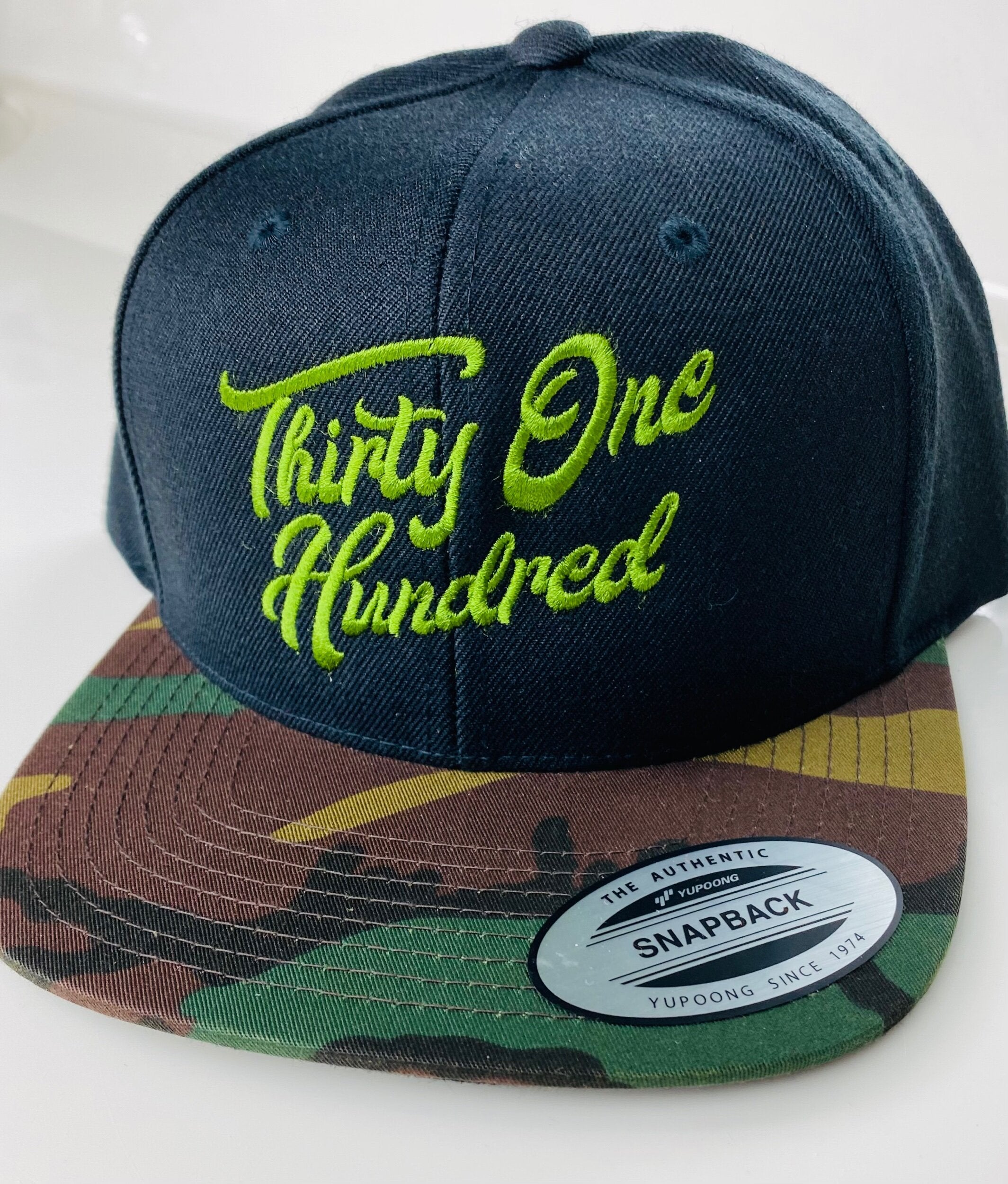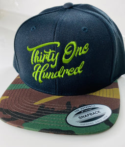 Snapback-Black/ Camo Bill/ Olive Script